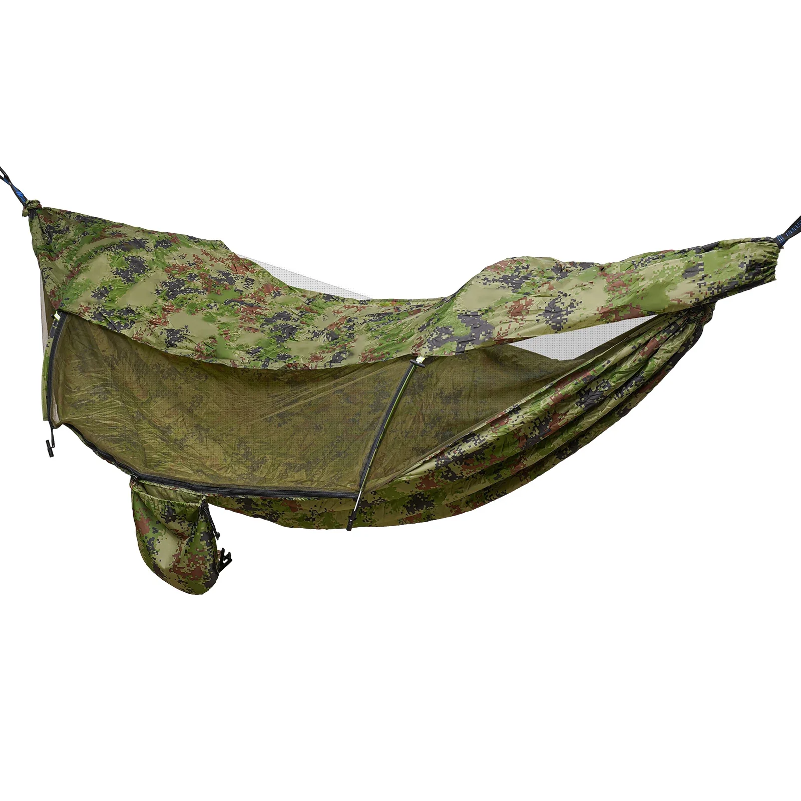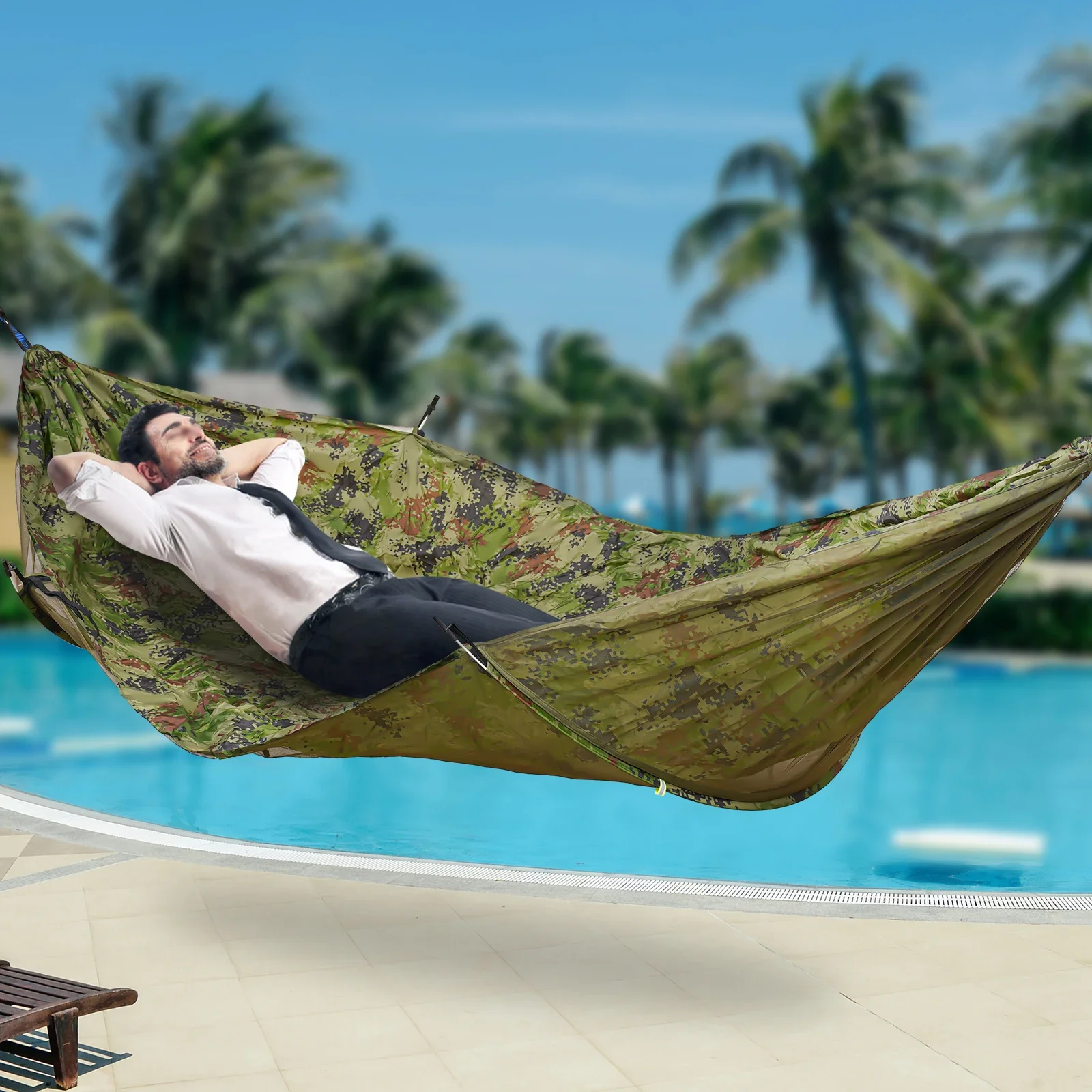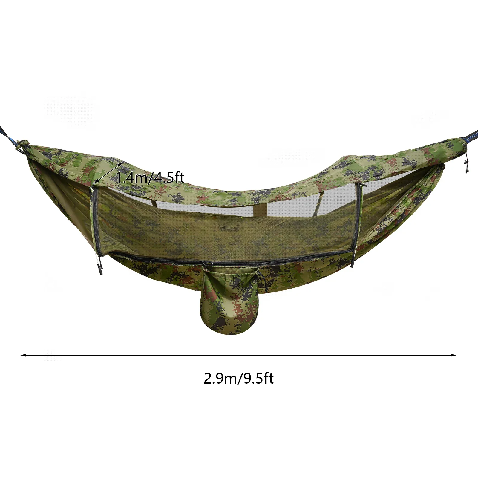 Comfortable and durable hammock made from 70D nylon and breathable mesh. Built-in mosquito net blocks insects while allowing airflow and sunlight for relaxing outdoor use.